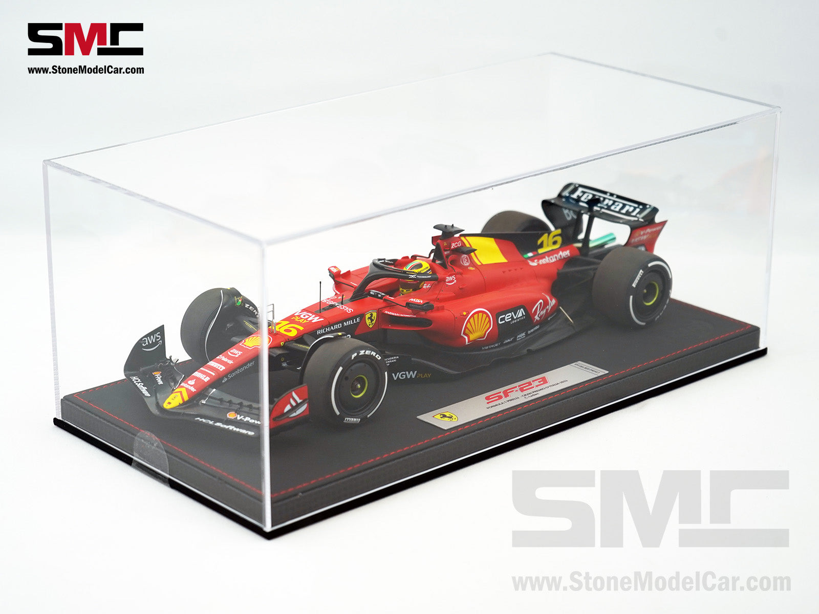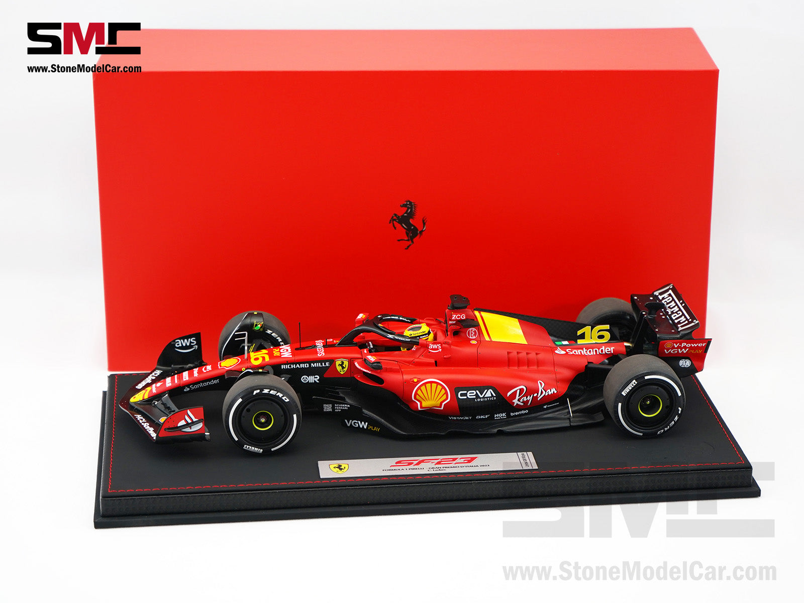 Ferrari F1 SF-23 #16 Charles Leclerc Italy Monza GP 2023 BBR 1:18 with Leather Base