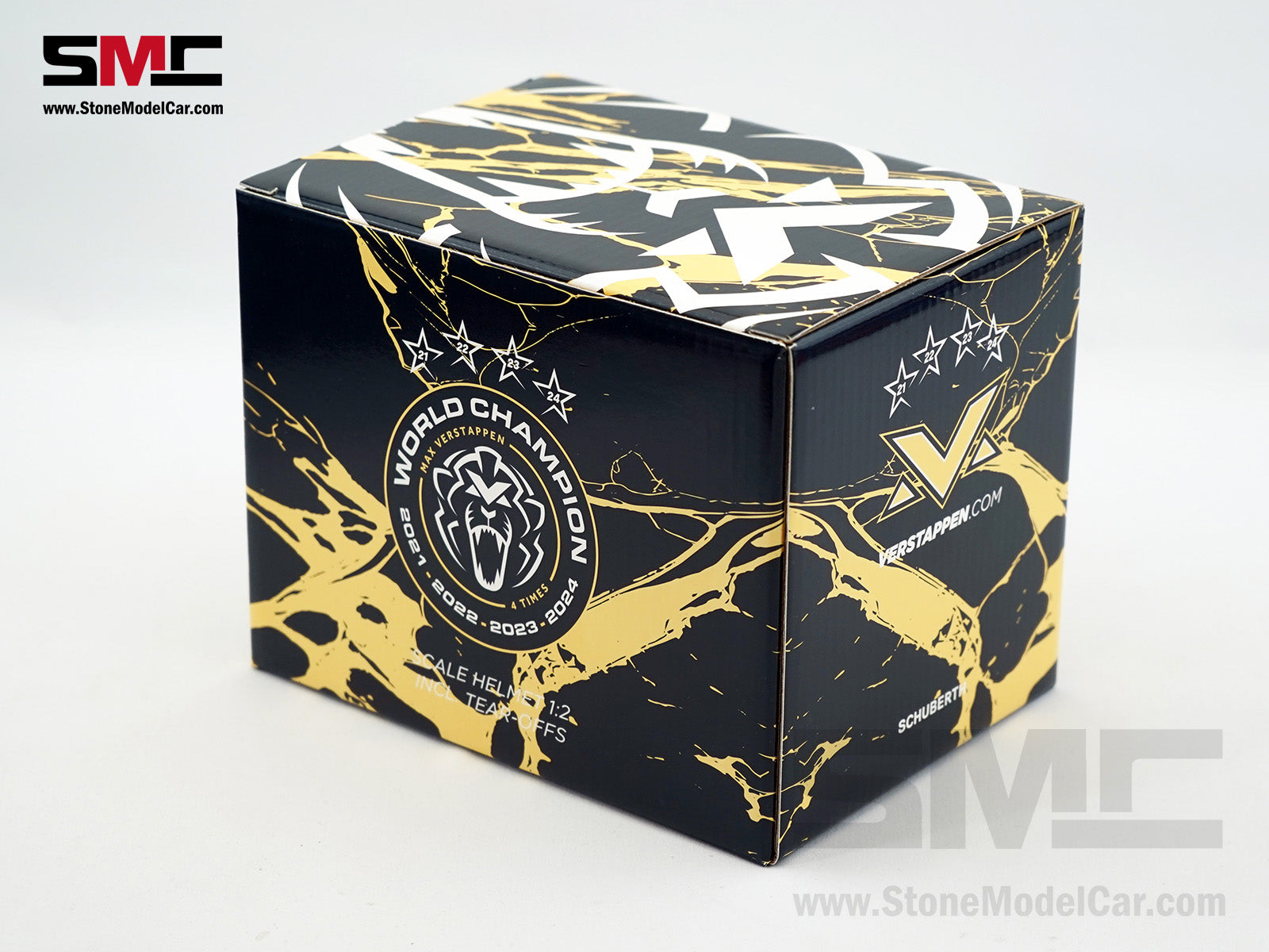 The miniature helmet in 1/2 scale is a faithful replica of the driver's helmet of Max Verstappen from the Red Bull Racing Team from the Formula 1 season 2024, which he won the 4th Times World Champion.