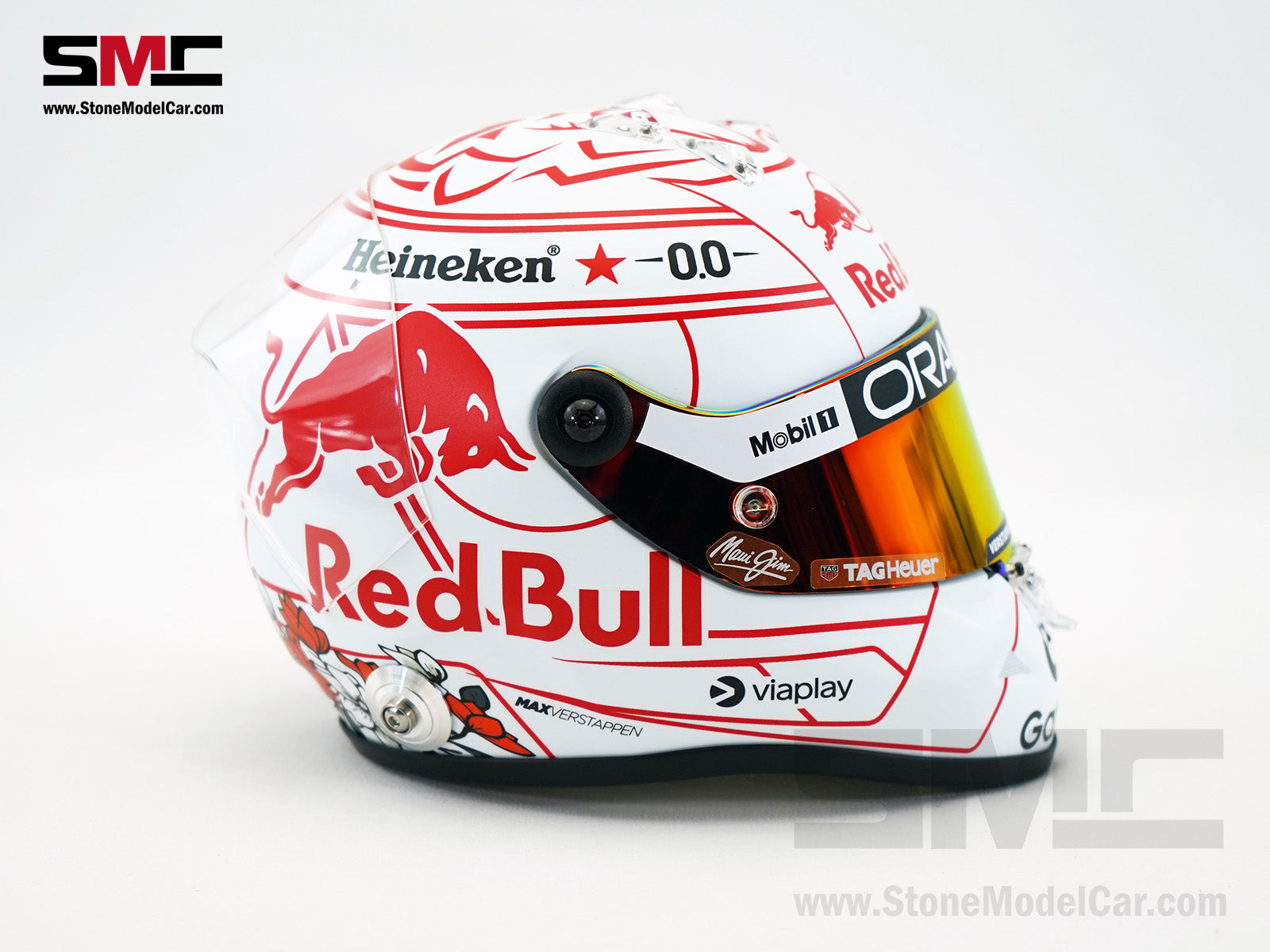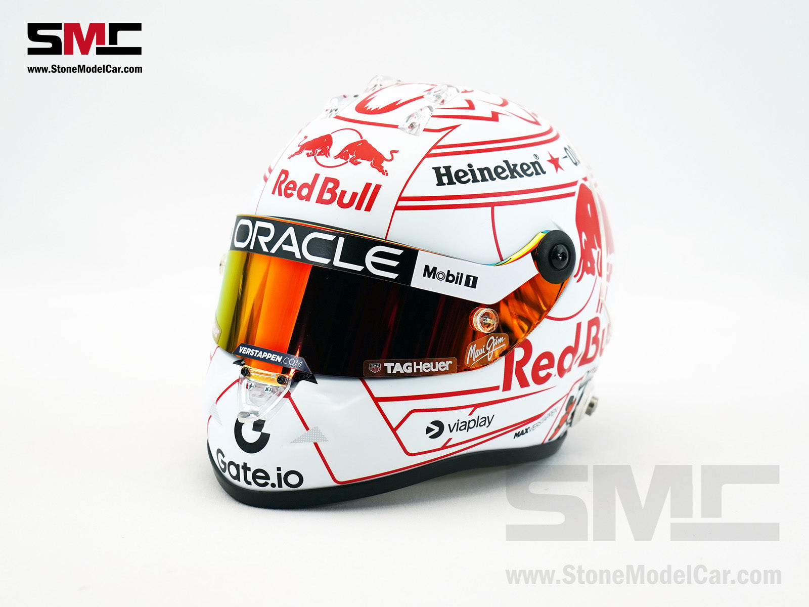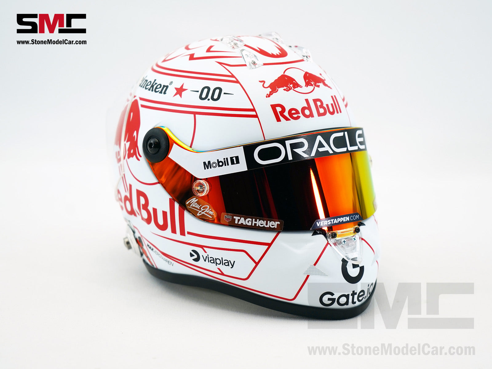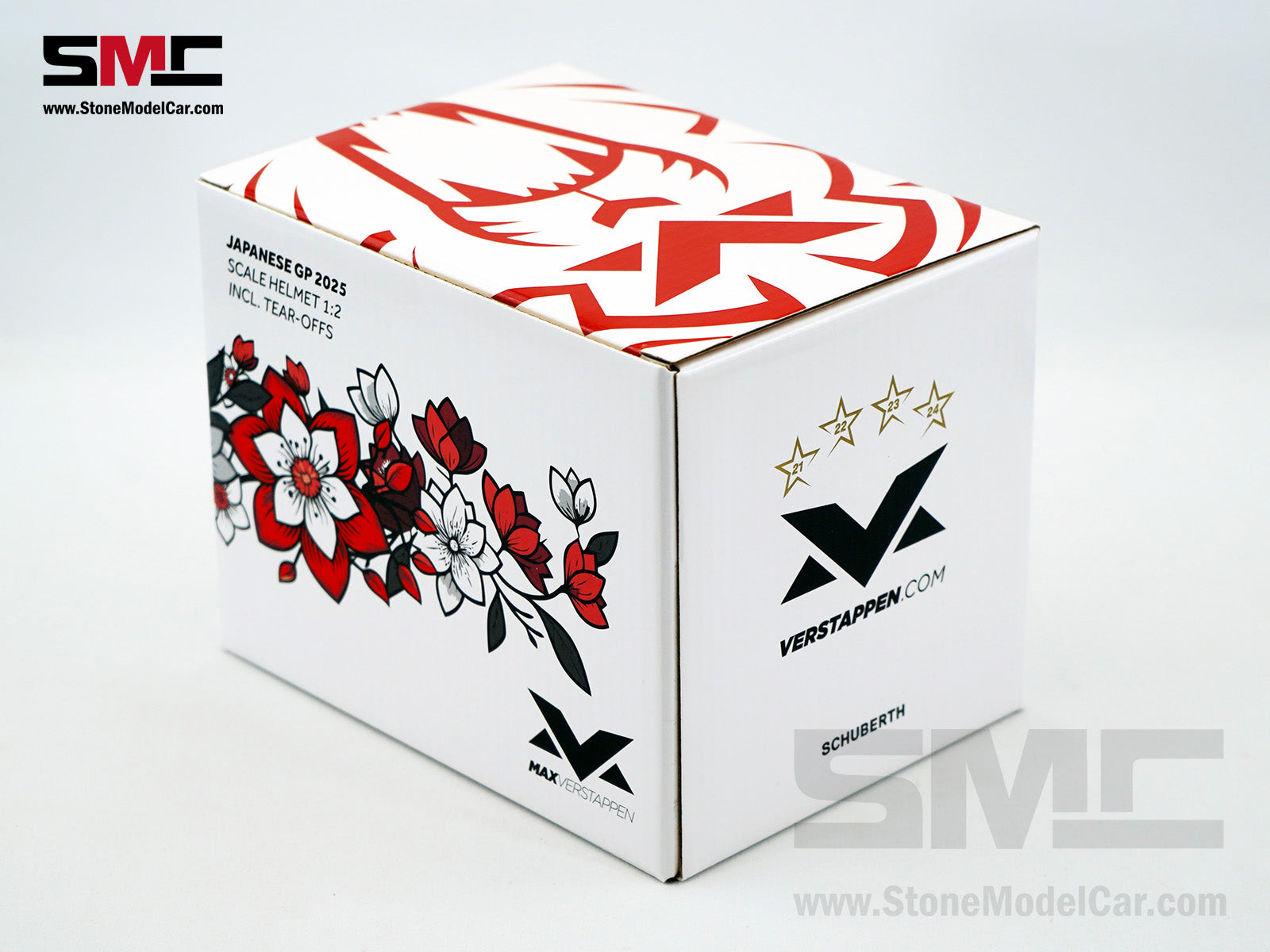 The miniature helmet in 1/2 scale is a faithful replica of the driver's helmet of Max Verstappen from the Red Bull Racing Team from the Formula 1 Japan GP 2025, which he won the race during the Grand Prix.